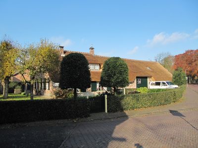 Boerderij, topgevel, langgerekt rieten dak op langhuis