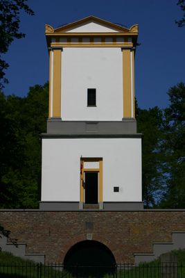 Witgesausde bakstenen duiventoren, op vierkante plattegrond met pannen zadeldak