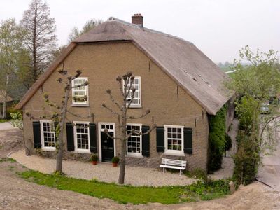 Boerderij onder rieten zadeldak. Voorgevel met vlechtingen en geblokte ontlastingsboog