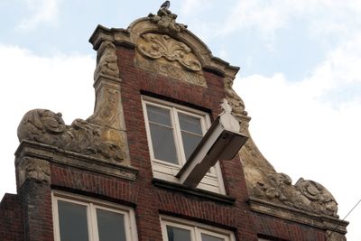 Pand met trapgevel met gepleisterd bovendeel, sierelelementen in de ontlastingsbogen, uitgekraagde toppilaster en engelenkopje