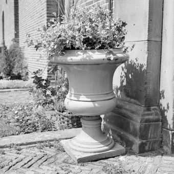 Twickel: twee gietijzeren, grijs geschilderde tuinvazen in kelkvorm voor ingangspartij bouwhuizen