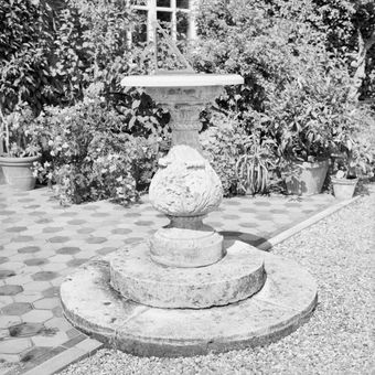 Twickel: marmeren tuinvazen oranjerietuin op vierkant voetstuk van Bentheimer zandsteen