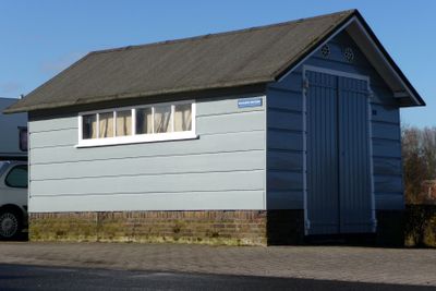 Vierkant gebouwtje op de grens van het kerkterrein, waarin vensters met kleine roedenverdeling