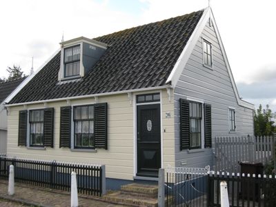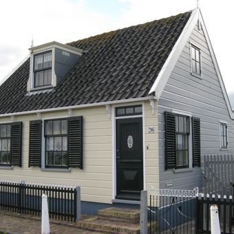 Houten huis, gepotdekselde zijwanden en puntvormig voorschot. Goede pui en puilijst