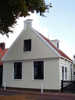 Houten huis met aangebouwde zijbeuk aan de rechterzijde en puntvormig voorschot