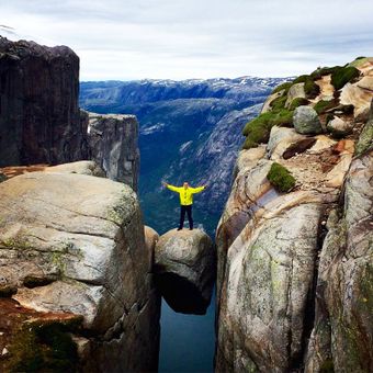 Il masso Kjeragbolten rimane sospeso tra due pareti rocciose a 1110 metri di altitudine, con vista sul Lysefjord e sulle montagne circostanti.