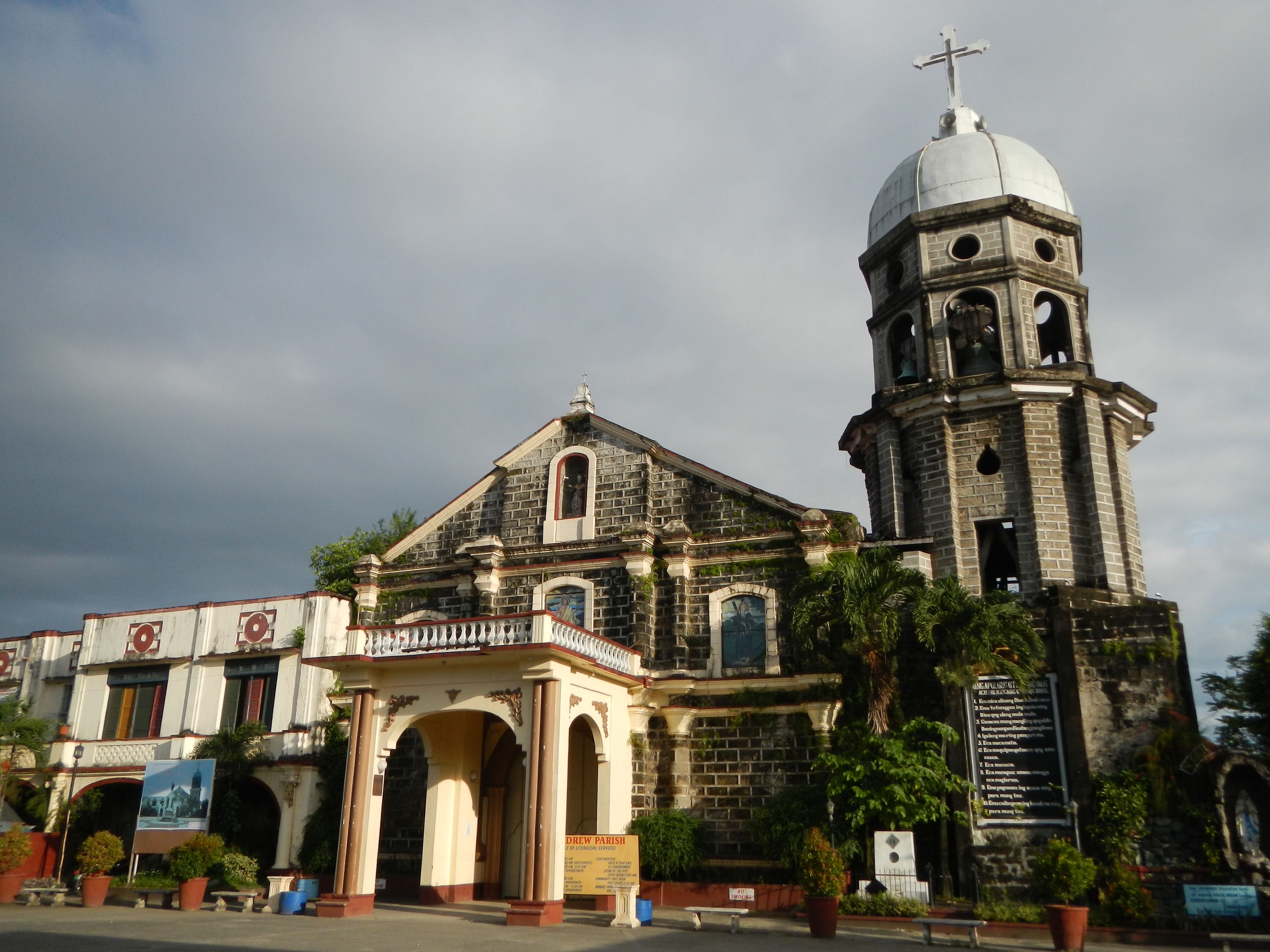 La Chiesa di Sant'Andrea Apostolo presenta una facciata simmetrica con elementi decorativi e lavorazioni in pietra caratteristiche dell'architettura religiosa filippina.