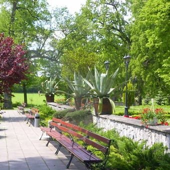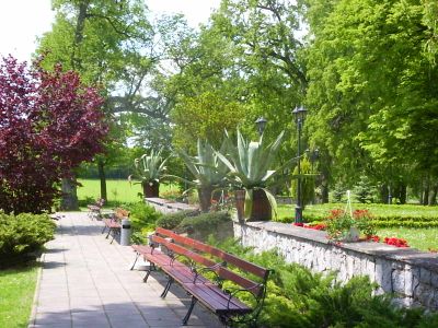 Park z aleją widokową oraz drzewostanem, z dziedzińcem przed pałacem