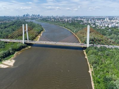 Il Ponte Siekierkowski si estende per 500 metri sulla Vistola con due piloni a forma di H che raggiungono 90 metri di altezza.