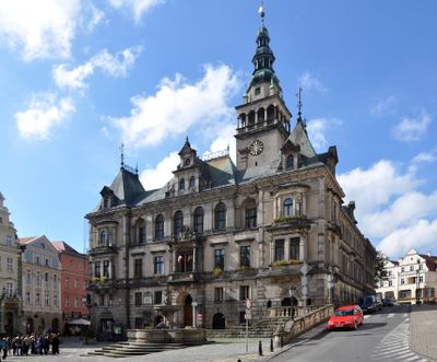Il municipio presenta una torre medievale con galleria rinascimentale e guglia barocca, decorato con ornamenti architettonici sul tetto e sulle facciate.
