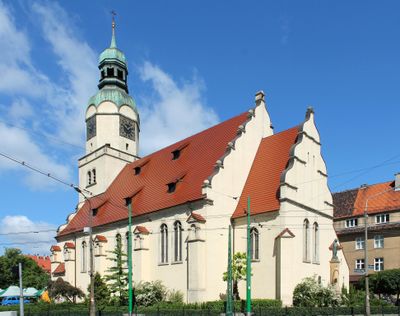 Un monumento all'Arcangelo Michele si erge davanti alla chiesa, segnando la sua trasformazione da luterana a cattolica dopo la Seconda Guerra Mondiale.