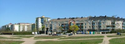 Il quartiere si estende su un'ampia area con complessi residenziali moderni, case tradizionali e spazi verdi lungo il fiume Warta.