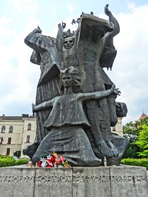 La scultura, progettata da Franciszek Masiak, rappresenta la sofferenza e la resistenza dei cittadini durante la Seconda Guerra Mondiale.