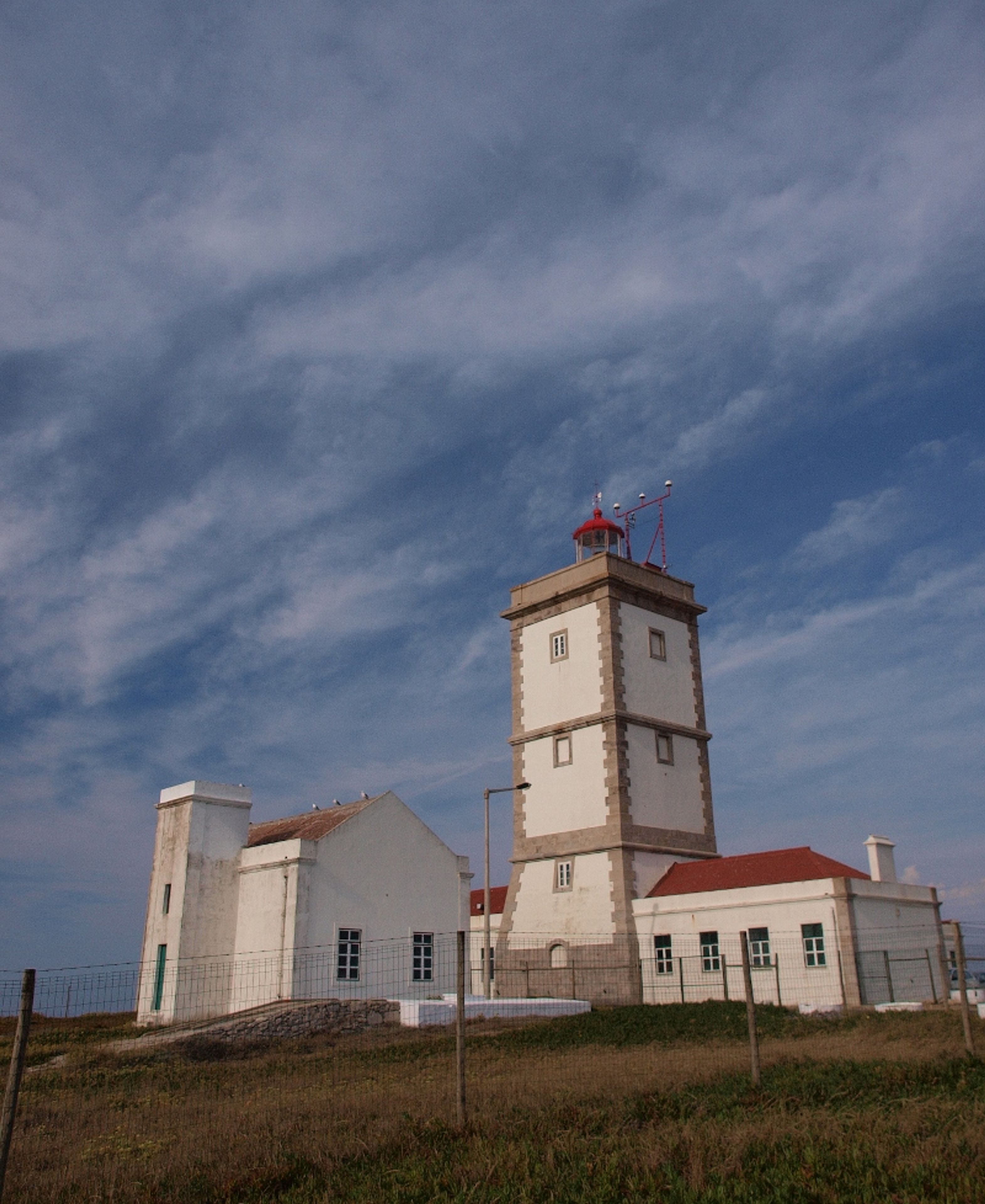 Il Faro di Cabo Carvoeiro presenta una torre quadrata bianca e rossa alta 27 metri con un edificio annesso rettangolare per i guardiani.