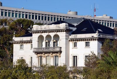 Il Palazzo Mendonça presenta una struttura centrale con due ali laterali, incorporando elementi architettonici classici italiani sui tre livelli.