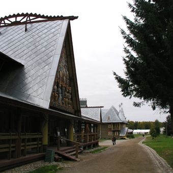 Verkhniye Mandrogi è un insediamento di case in legno costruite lungo il fiume Svir che riflette gli stili costruttivi del nord russo. Le strutture mostrano dettagli tipici in legno e elementi artigianali caratteristici dell'architettura tradizionale della regione.