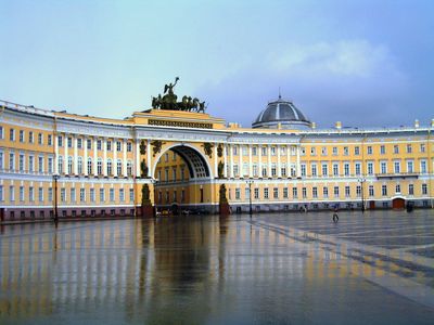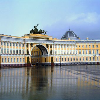 Il Palazzo dello Stato Maggiore si estende lungo Piazza del Palazzo con una facciata curva di 580 metri e un arco trionfale centrale.