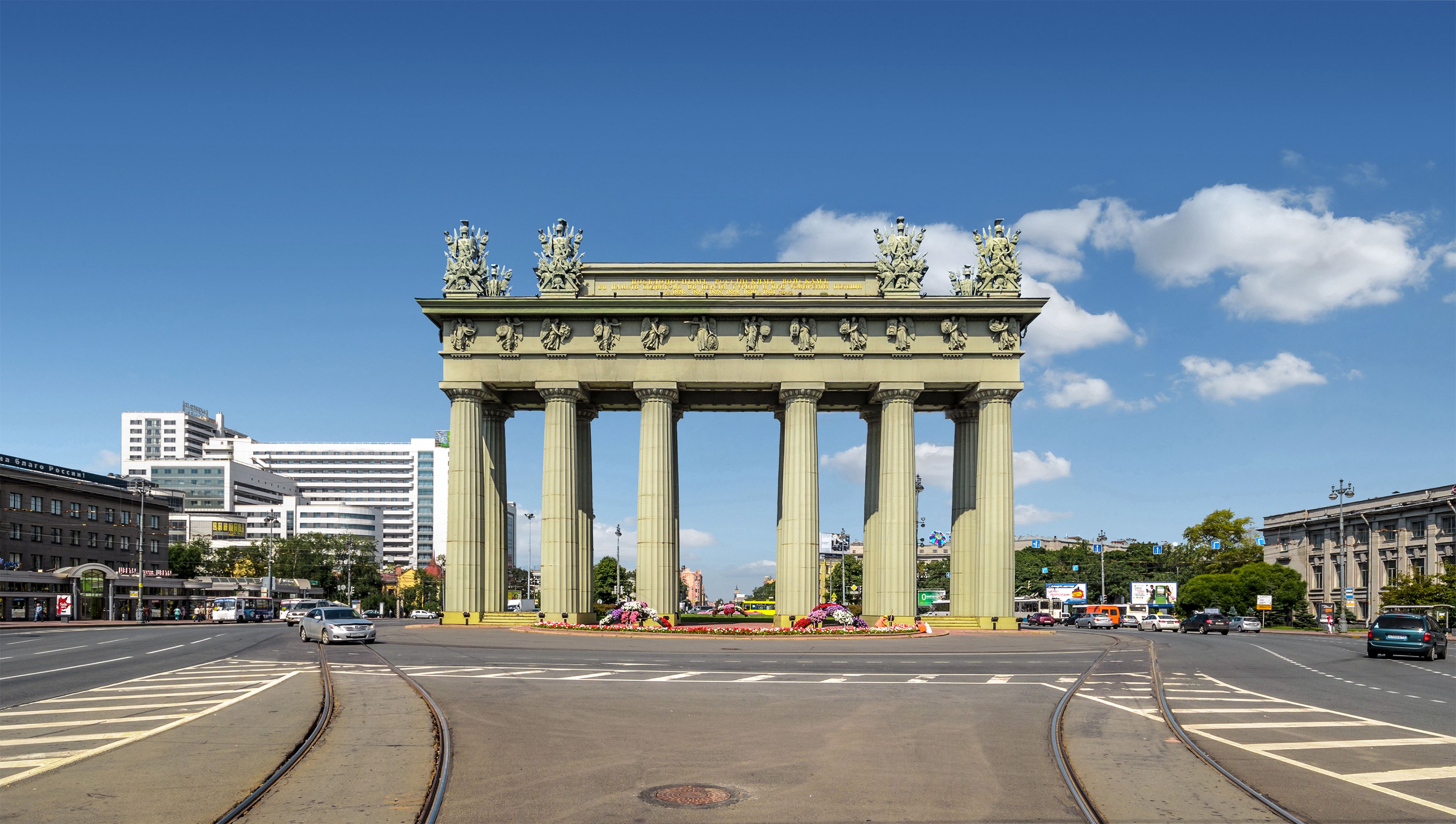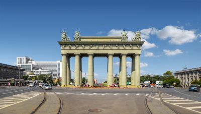 La Porta Trionfale di Mosca si erge come una struttura neoclassica monumentale con dodici colonne massicce in ghisa che sostengono un portico ornato decorato con trofei militari e rilievi scultorei.