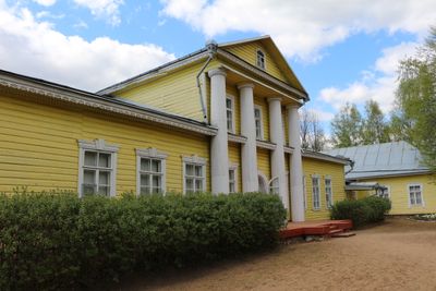 Il Museo Riserva Modest Mussorgsky occupa una residenza del XIX secolo con mezzanino, colonne e balaustra sul lago Zhizhitskoye nella regione di Pskov.