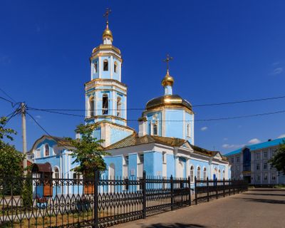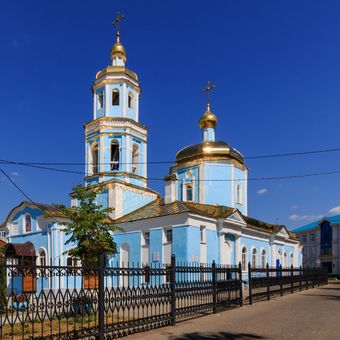 La Chiesa Tikhvinskaya si presenta come una struttura religiosa con elementi architettonici dettagliati che rappresentano i disegni ecclesiastici della tradizione ortodossa russa.