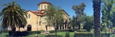 La Hagia Sophia si erge vicino al Mar Nero con una cupola centrale, campanile e quattro portici secondo i principi architettonici bizantini.