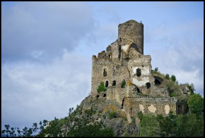 Il castello sorge su uno sperone roccioso a 150 metri sopra il fiume Alagnon, con mura difensive e una torre centrale.