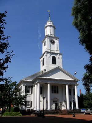 La Prima Chiesa di Cristo si presenta come struttura religiosa con caratteristiche architettoniche tradizionali del New England con esterno bianco e alta guglia.