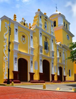 La Cattedrale Metropolitana emerge nel centro città con la sua facciata bianca, torre dell'orologio prominente e dettagli architettonici in stile barocco.