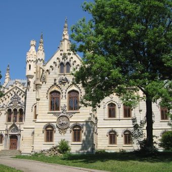 Il Palazzo Sturdza mostra architettura neogotica con una facciata simmetrica, archi a sesto acuto e guglie decorative.